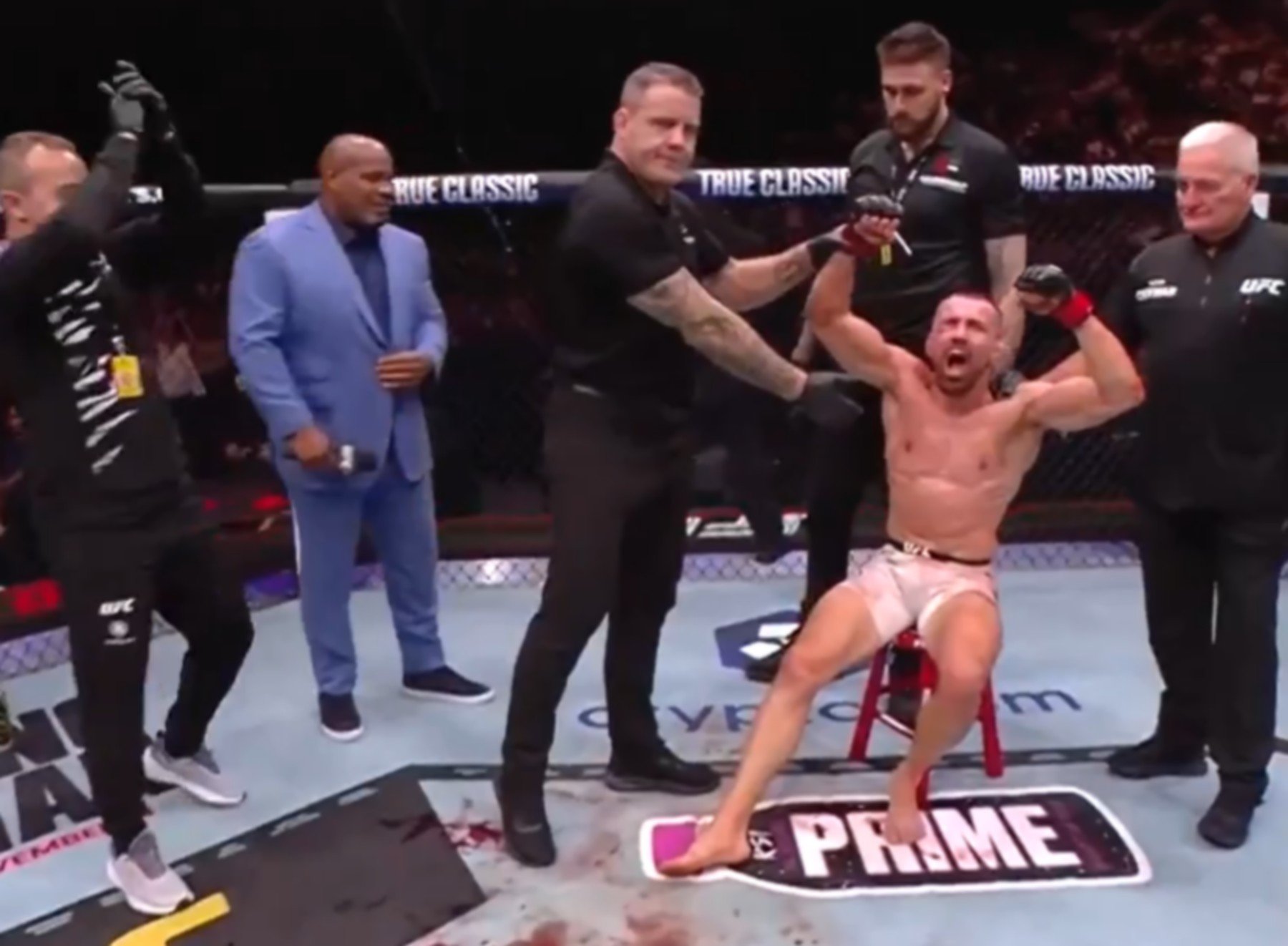 „Cítim sa úžasne, ale zlomil som si členok. Zlomil som si ho v treťom kole, no nakoniec som to prežil v tom poslednom kole. Prepáčte ľudia, chcel som ukázať veľký výkon a zápas večera, lenže je to tak, ako to je. Som však skutočne rád, ďakujem vám.