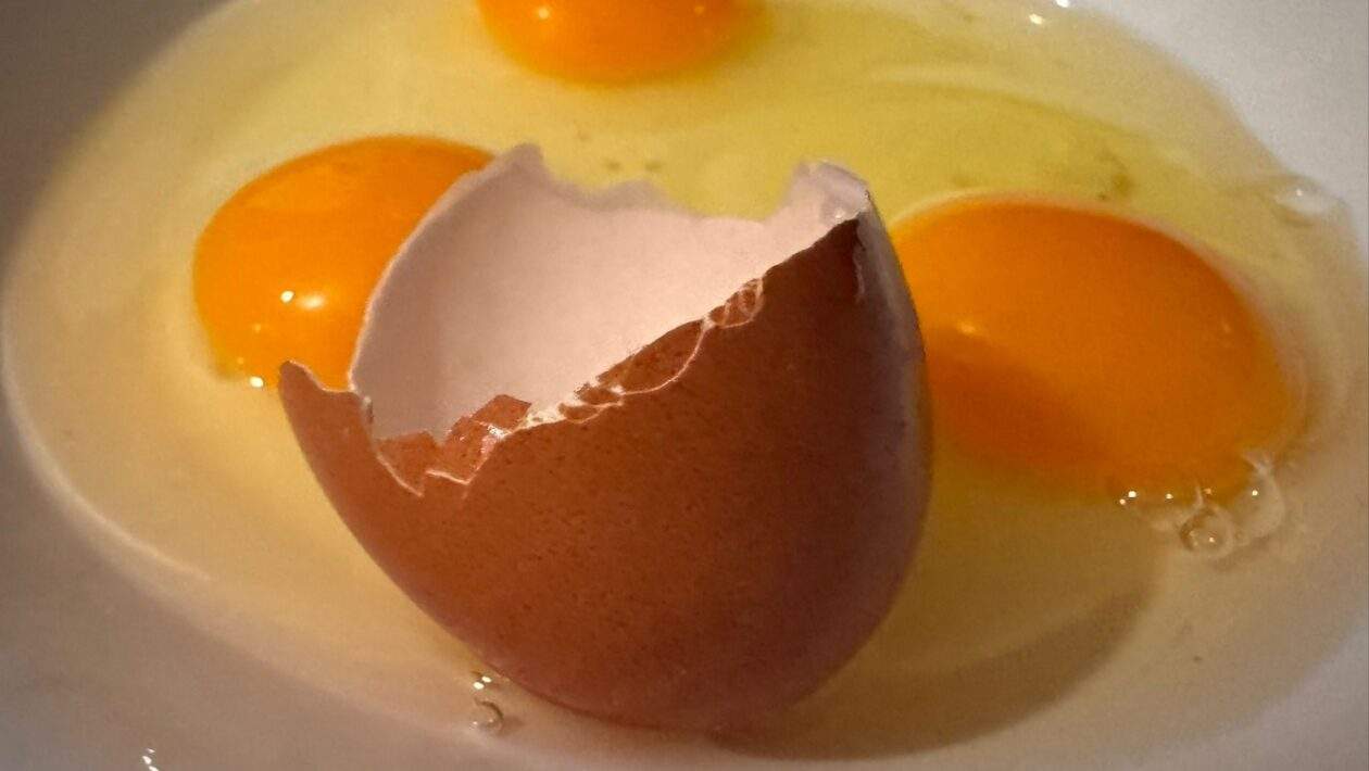 Malý, ostrý úlomok vaječnej škrupiny si veselo pláva v žĺtku alebo, čo je ešte horšie, v lepkavom bielku.