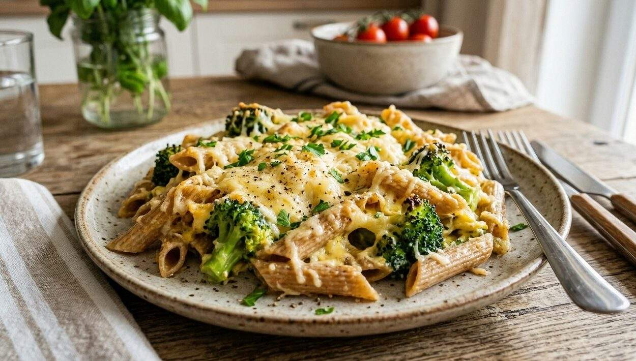 - Obed: Zapekané celozrnné cestoviny s brokolicou, zaliate vajíčkom a posypané strúhaným eidamom (30 % tuku v sušine).
